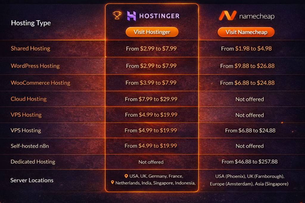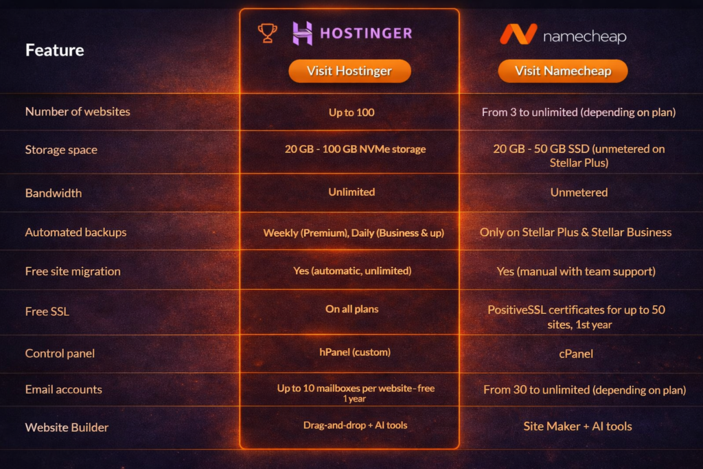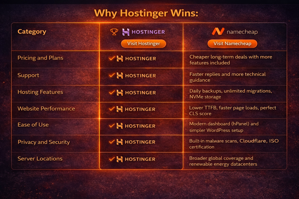 If your priority is website speed, uptime stability, and scalable hosting features, Hostinger often has the edge. If your focus is domain management and affordable entry hosting, Namecheap can be sufficient.